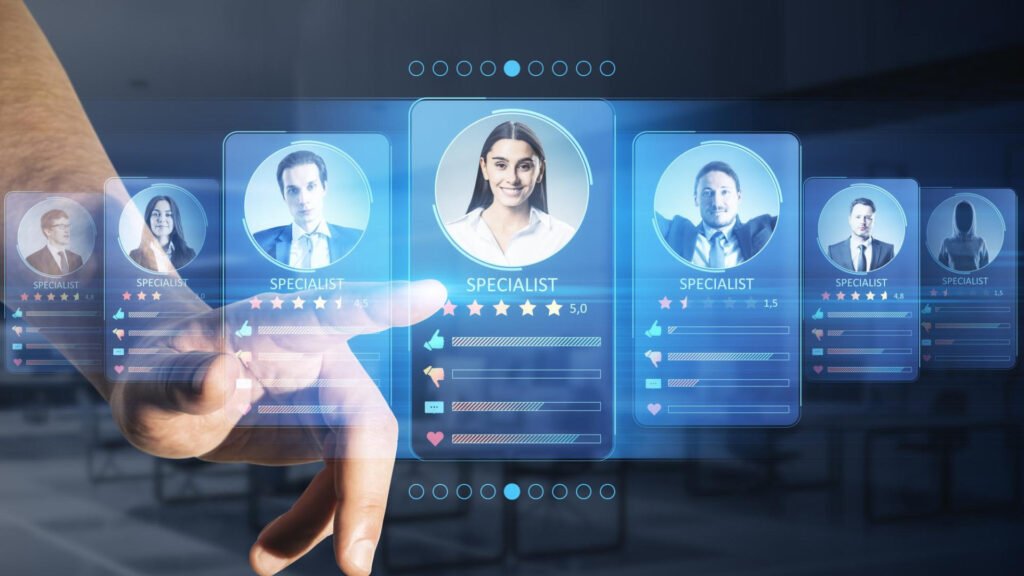 Un profesional de ventas analizando un organigrama digital con perfiles de clientes potenciales para crear buyer personas B2B.